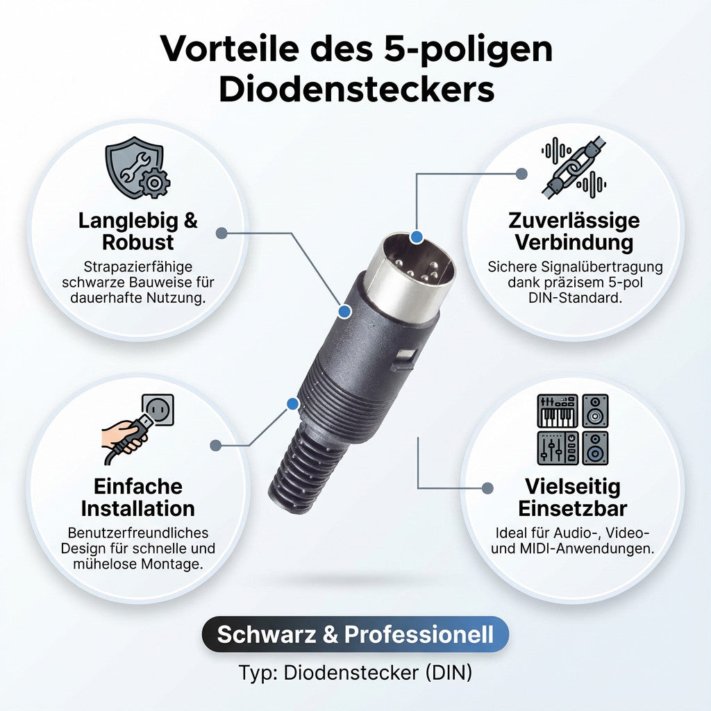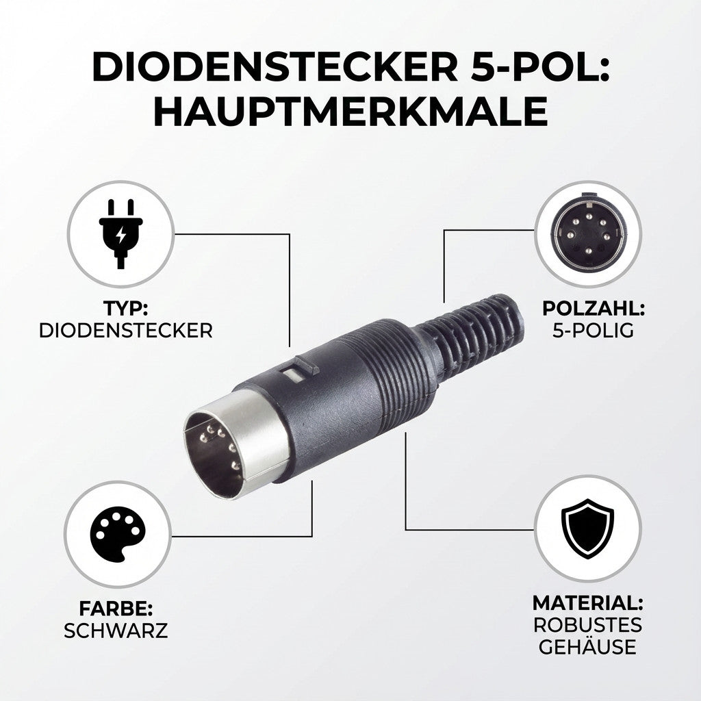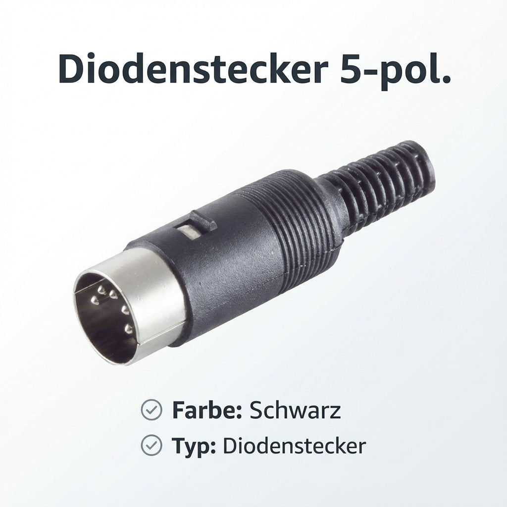 Der 5-polige Diodenstecker zeichnet sich durch eine einfache Handhabung sowie eine zuverlässige Signal- und Leistungsübertragung aus. Sein Design und seine technischen Eigenschaften gewährleisten eine sichere und dauerhafte Verbindung in Ihrer technischen Einrichtung.